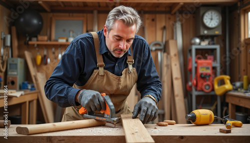 Focused carpenter working in vibrant industrial workshop, craftsmanship