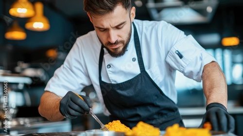 Focused chef meticulously prepares vibrant yellow food garnish in professional kitchen.
