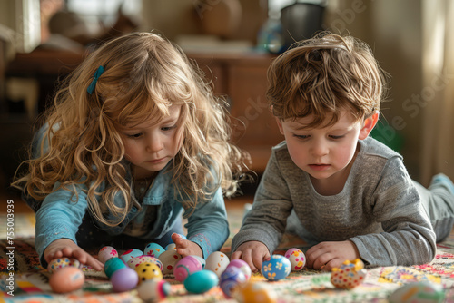 Focused child creatively decorating Easter eggs with colorful patterns at a home setting..
