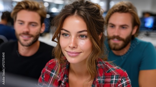 Focused Collaboration: Captivating trio engaged in a focused dialogue, exemplifying unity and synergy with a blend of modern business settings.