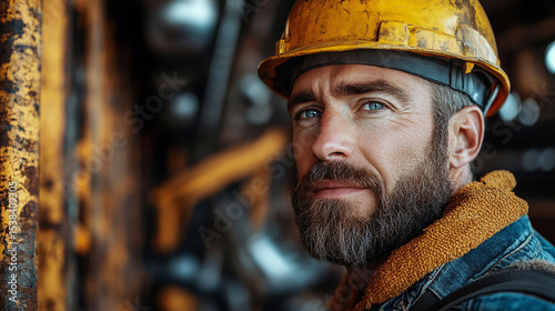 Focused construction worker in hard hat, close-up portrait.