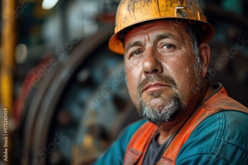 Focused construction worker wearing hard hat and safety gear during daylight hours in a busy industrial setting