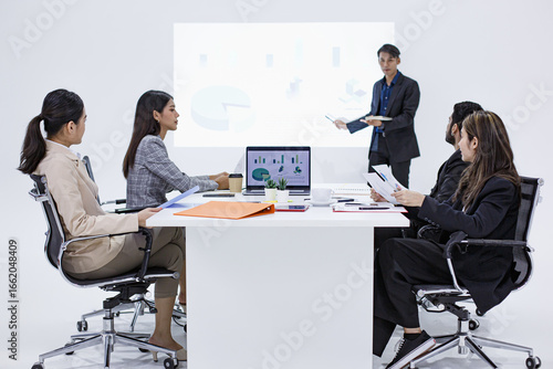 Focused corporate team attending strategy meeting with projector and charts, highlighting leadership, innovation, and teamwork in professional workplace setting.