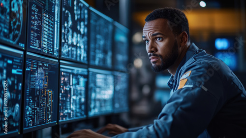 focused engineer clad in crisp uniform analyzes data on multiple screens, showcasing concentration and expertise in high tech environment