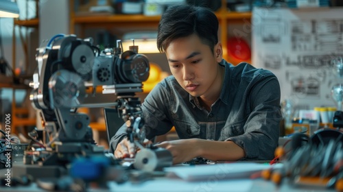 Focused engineer working on robotics project in a workshop filled with tools and machinery, highlighting innovation and technology.