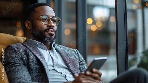 Focused entrepreneur sitting by a large window, holding smartphone while analyzing business data