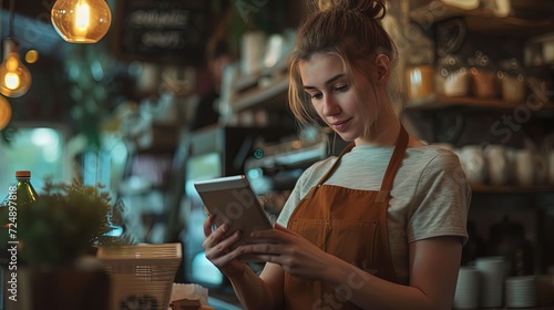 Focused female barista in a trendy cafe using a digital tablet for work-related tasks amidst warm ambient lighting.