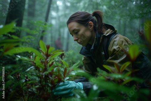 Focused Female Biologist Collecting Plant Samples in a Misty, Lush Forest