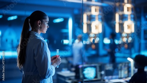 Focused female scientist holding test tube with red sample in modern laboratory