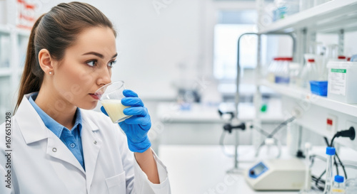 Focused female scientist in protective gloves tasting laboratory sample for quality analysis in modern bright research facility with advanced scientific equipment