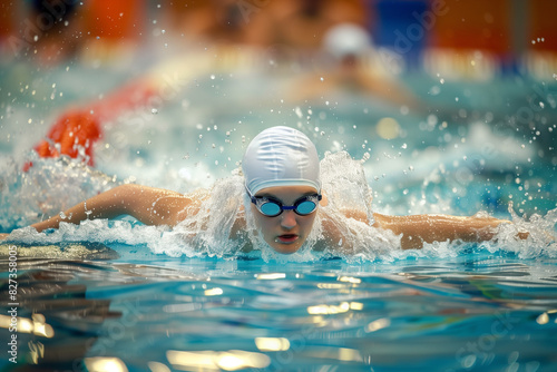 Focused Female Swimmer Competing in Butterfly Stroke.