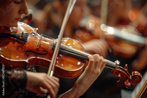 Focused Female Violinist Performing in Orchestra During Live Concert