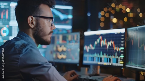Focused Financial Analyst Reviewing Comprehensive Market Data on Dual Computer Monitors in Office Environment