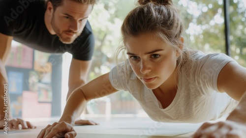 Focused fitness training with determined woman performing plank exercise in gym environment
