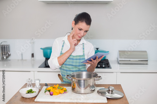 Focused gorgeous woman wearing apron using tablet