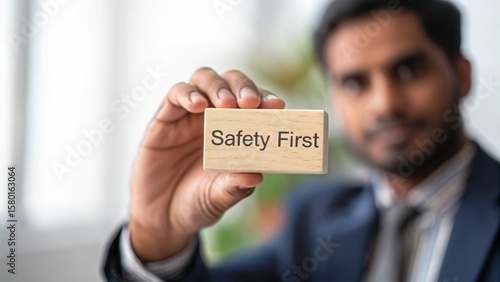 Focused Indian Professional Holding Wooden Cube Marked ‘Safety First’