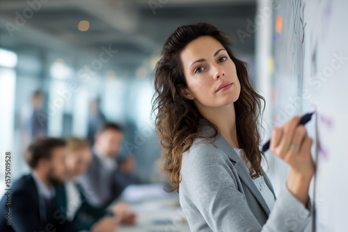 Focused Leadership: A poised woman, deeply engrossed in thought, pens her vision upon the crisp white canvas of a whiteboard.
