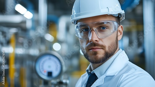 Focused Male Engineer in Industrial Setting Wearing White Coat and Safety Gear
