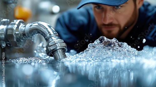 Focused male technician inspects water flow from industrial pipe into tank.