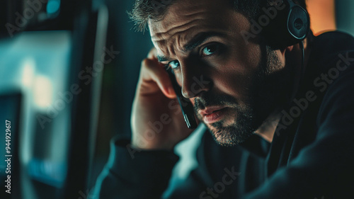 Focused man on a headset engaging in a serious conversation while working late at a computer in a dimly lit environment