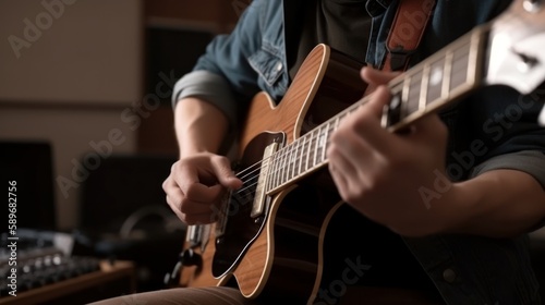 Focused man playing guitar in a music studio with skill and creativity. Generative AI.