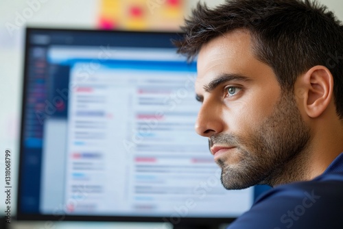 Focused man with serious look at work in front of a desktop, for online business