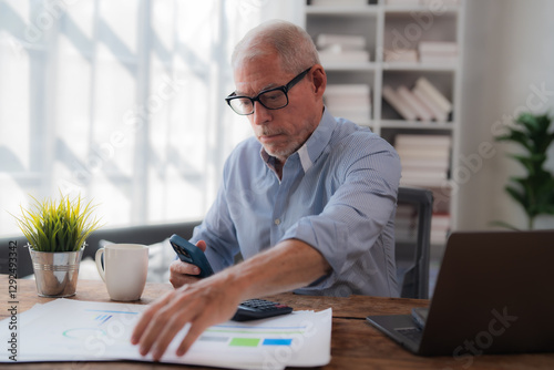 Focused mature professional reviewing financial data, holding smartphone and analyzing charts at his desk in a home office setting, showcasing productivity and remote work
