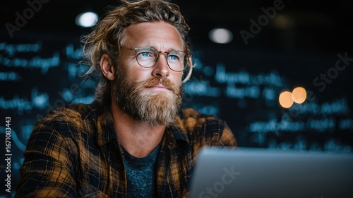 Focused Modern Professional Working Late at Night in Tech-Savvy Environment