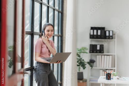 Focused Productivity: Young woman with headphones on, looking confident and happy while working on her laptop in a modern office setting.