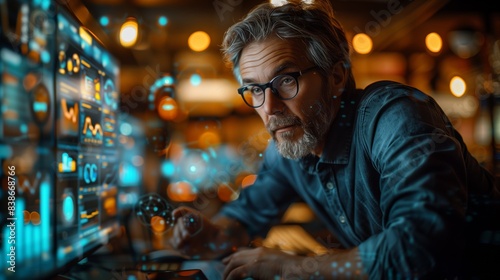 Focused professional analyzing data. Mature professional with glasses analyzing data on multiple screens, displaying concentration and expertise in a tech-driven environment.
