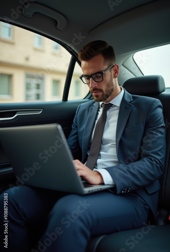 Focused Professional Working on Laptop in Backseat of Car During Commute