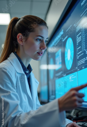 Focused Scientist Analyzing Data on Interactive Screen, Cell Therapy, Healthcare Technology