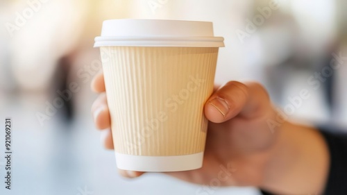 Focused shot of a worker's hand holding a coffee cup with a union logo, symbolizing unity and community, Labor Day