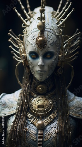 Focused shot of an alien, intricate patterns on its face, donning a Mesopotamian royal crown, with cuneiform tablets in the background
