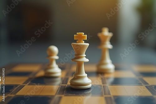 Focused Shot of Chess Pieces on a Chessboard, King, Queen, and Pawn in Formation