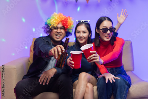 Focused shot on drinking glasses, group of happy Asian friends having fun, smiling at a party, clinking glasses Young man and woman having fun at a house party The room is lit with neon disco lights.