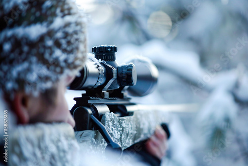 Focused soldier aiming through a rifle scope, showing intense concentration and determination.