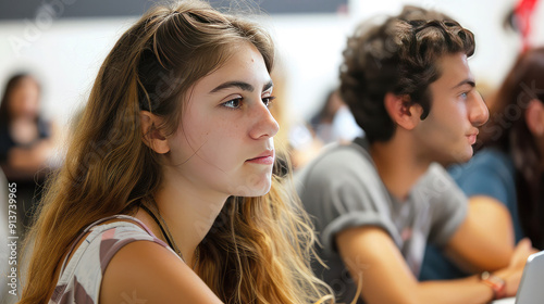Focused students in a classroom listening to a lecture. Indoor educational photography. Learning and education