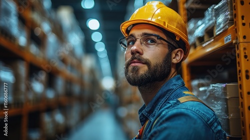 Focused Warehouse Worker in Safety Helmet with Glasses Observing Storage Shelves