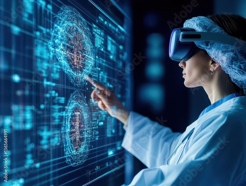 Focused Woman in White Coat and Glasses Engaging with Futuristic Virtual Interface Technology in a Professional and Dynamic Work Environment