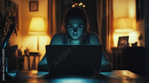 Focused woman sitting at a table, working on a laptop, typing, writing, researching, communicating online, and assisting clients through emails or studying remotely
