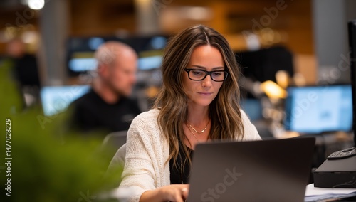 Focused woman working on laptop in office. Blured coworkers, plants, and other equipment visible