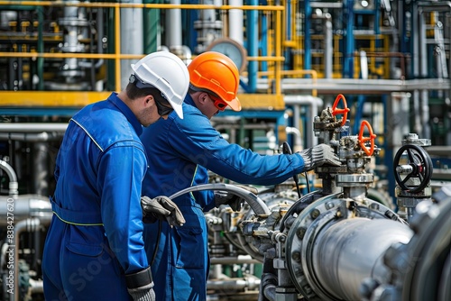 Focused worker adjusting machinery, a man in a hard hat working on a pipe, Oil refinery workers adjusting valves on processing units