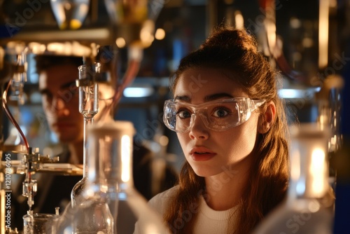 Focused young caucasian female scientist in laboratory setting with scientific equipment
