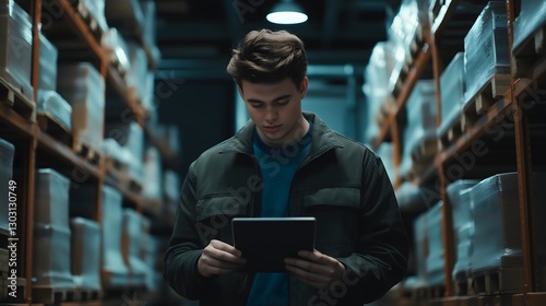Focused young man using a tablet in a modern warehouse filled with organized shelves of boxes during a busy workday