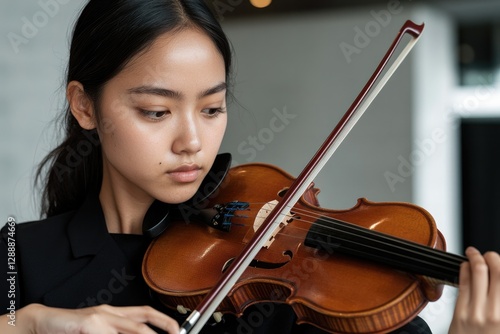 Focused young musician playing violin, immersing in melodic expr