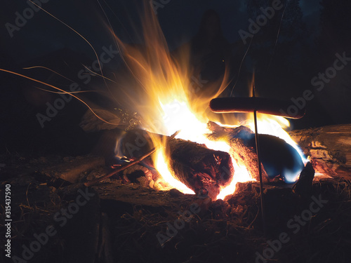 Fogata de noche en campamento de amigos con una salchicha el fuego que está con larga exposición