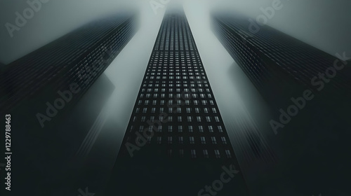 Foggy city skyscrapers, low angle