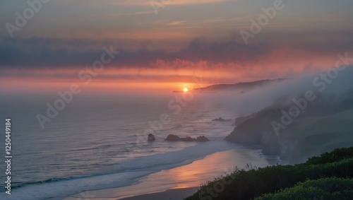Foggy Coastal Sunset Over Tranquil Waves with Scenic Cliffs and Vibrant Sky Reflections at Dusk in a Serene Coastal Environment