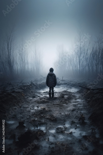 foggy dry forest. boy overlooking a barren muddy landscape in the fog.
